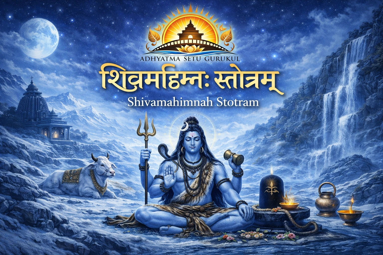 Chant and explore all 43 shlokas of Pushpadanta's great hymn — a surrender into Shiva's boundless glory.